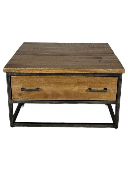 Industriële salontafel in combinatie van blank mangohout. Deze salontafel is van zwart gespoten metaal, de lades zijn van mangohout. Het mangohout is naturel van hout en een ware eyecatcher.